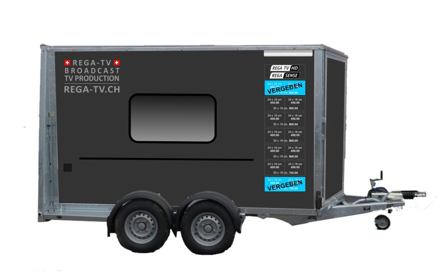 Wie im letzten Newsletter erwähnt, erhält unser REGA-TV Regieanhänger ein neues Aussendesign. Die Umsetzung möchten wir gerne gemeinsam mit regionalen Partnern realisieren. Dafür stehen auf dem Regiewagen verschiedene Sponsorenflächen zur Verfügung.